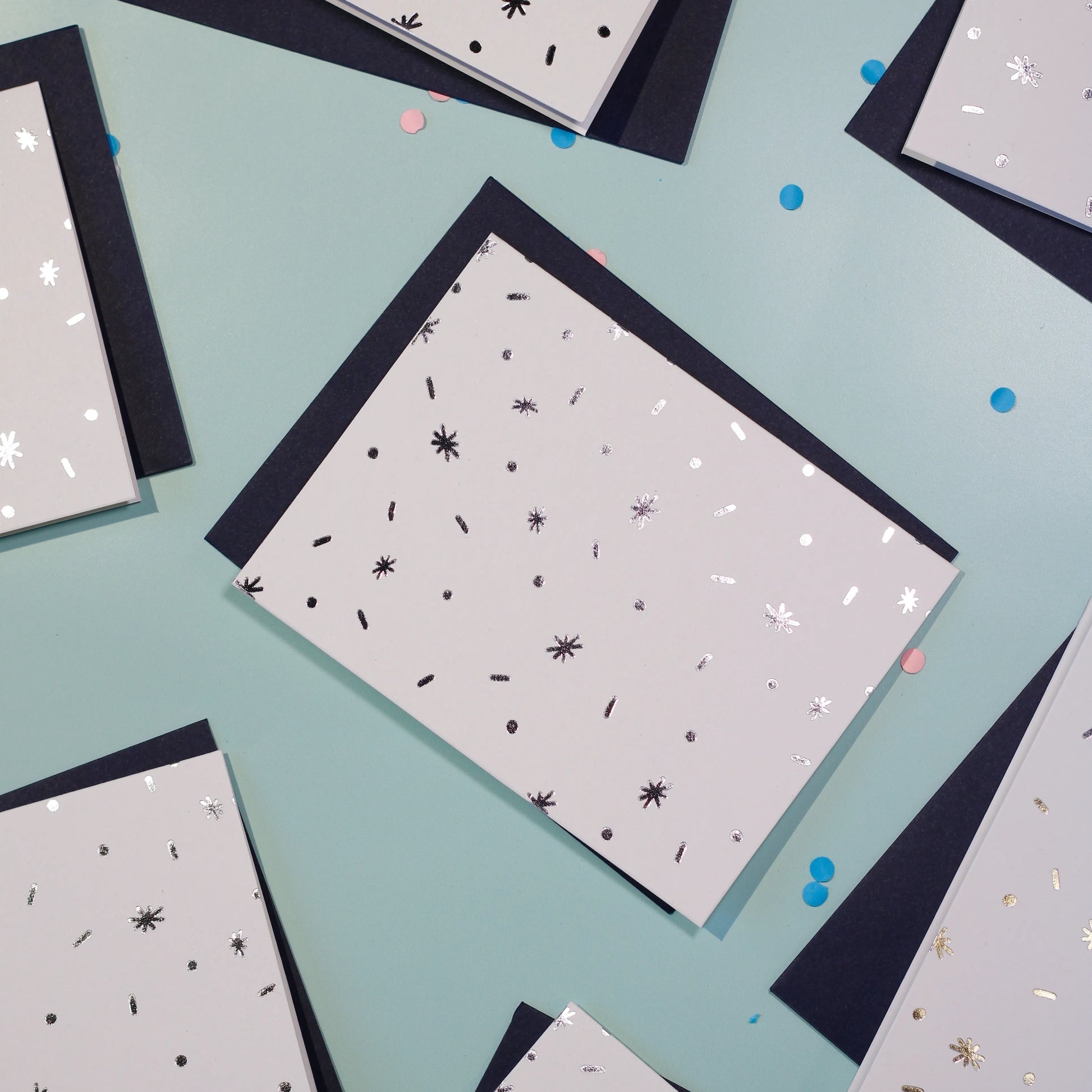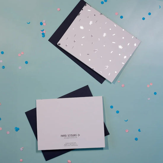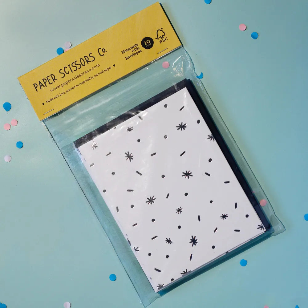 Our set of ten 'Confetti Notecards' shine with silver foil confetti that add a playful pop to your messages.