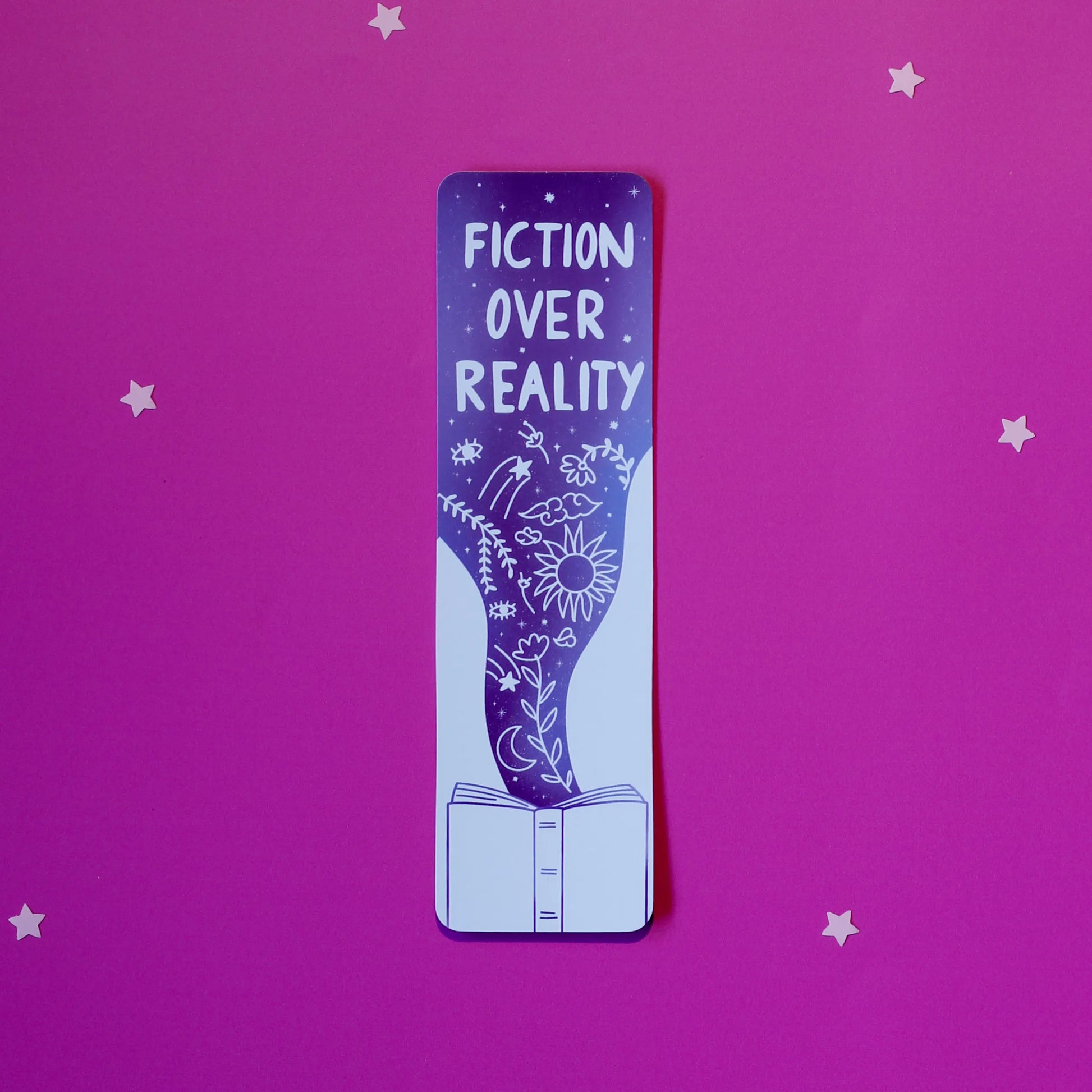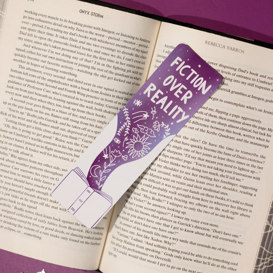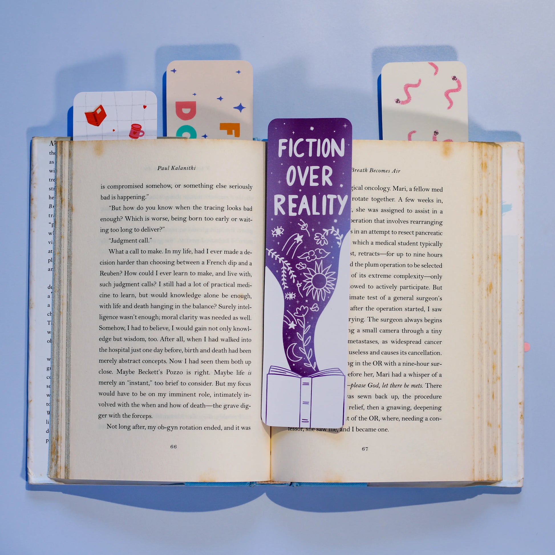 Our 'Fiction Over Reality' bookmark is an ombre purple beauty with dreamy illustrations and just the right dose of escapism. It's ideal for late-night page turners and weekend reading marathons.