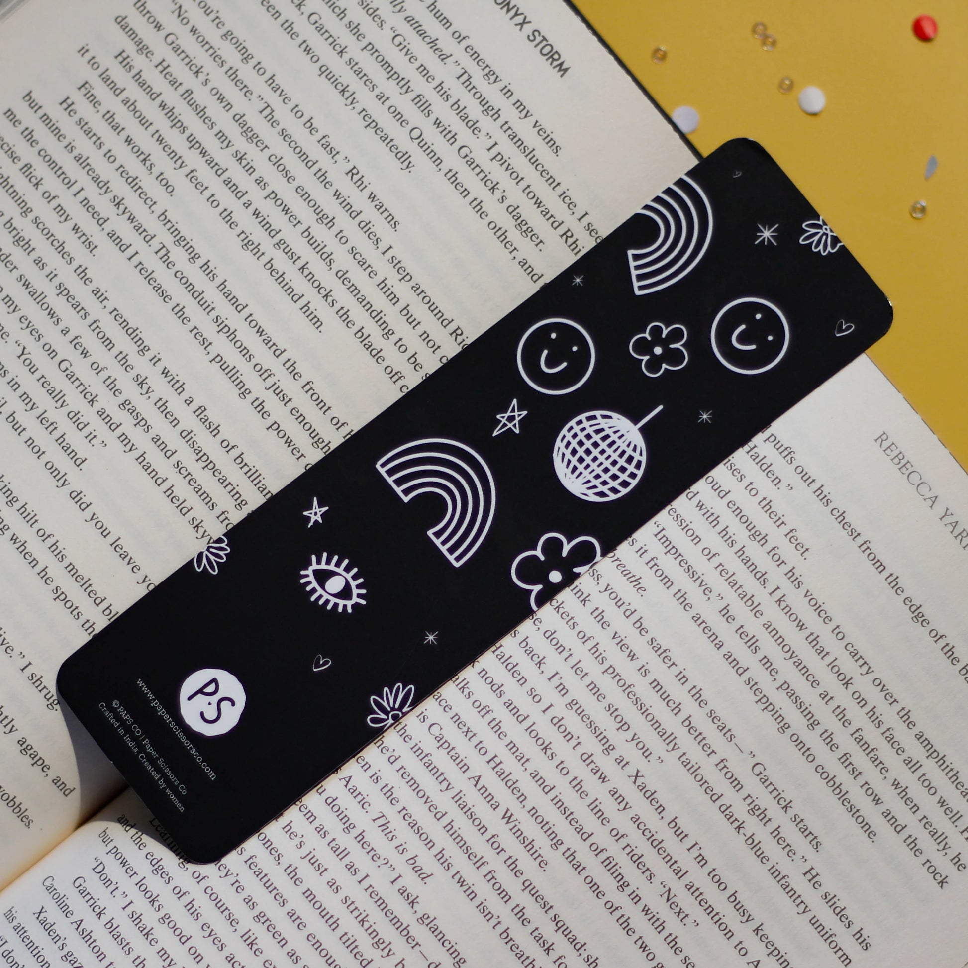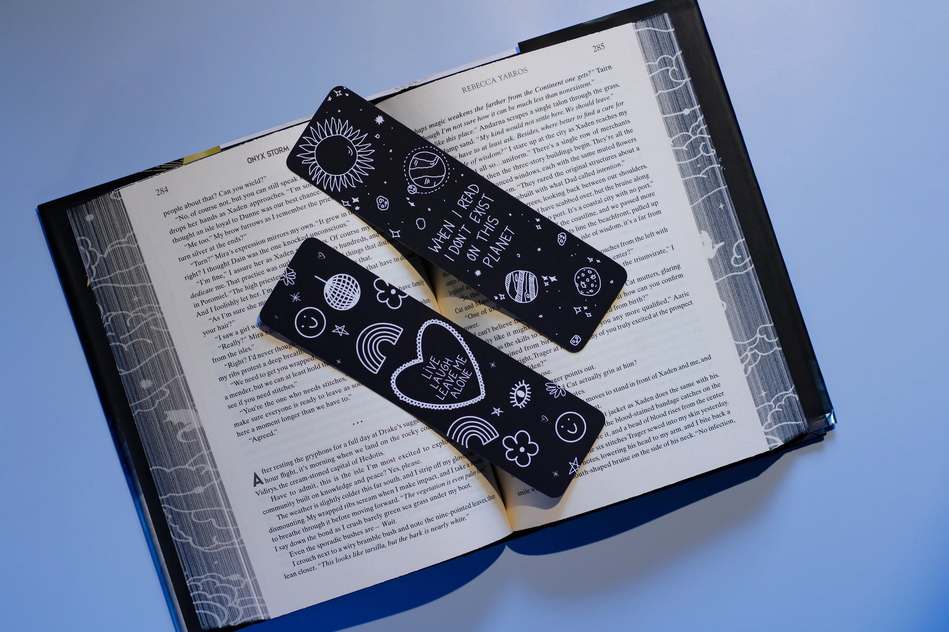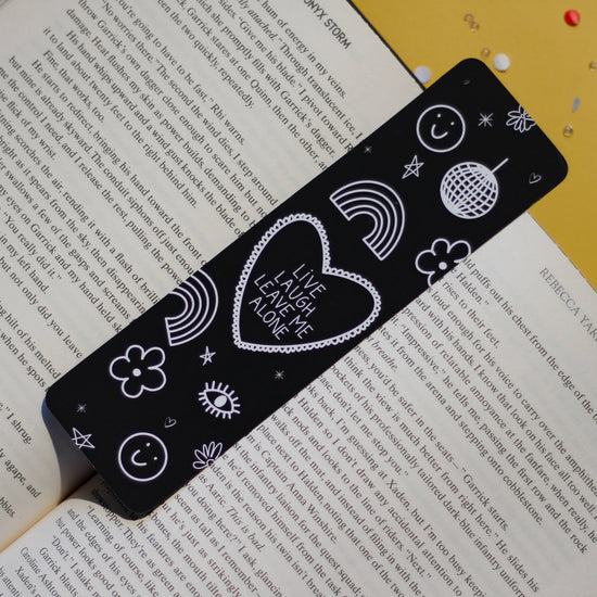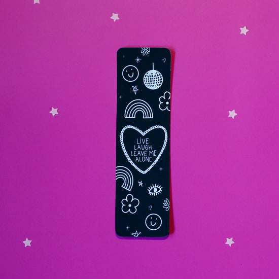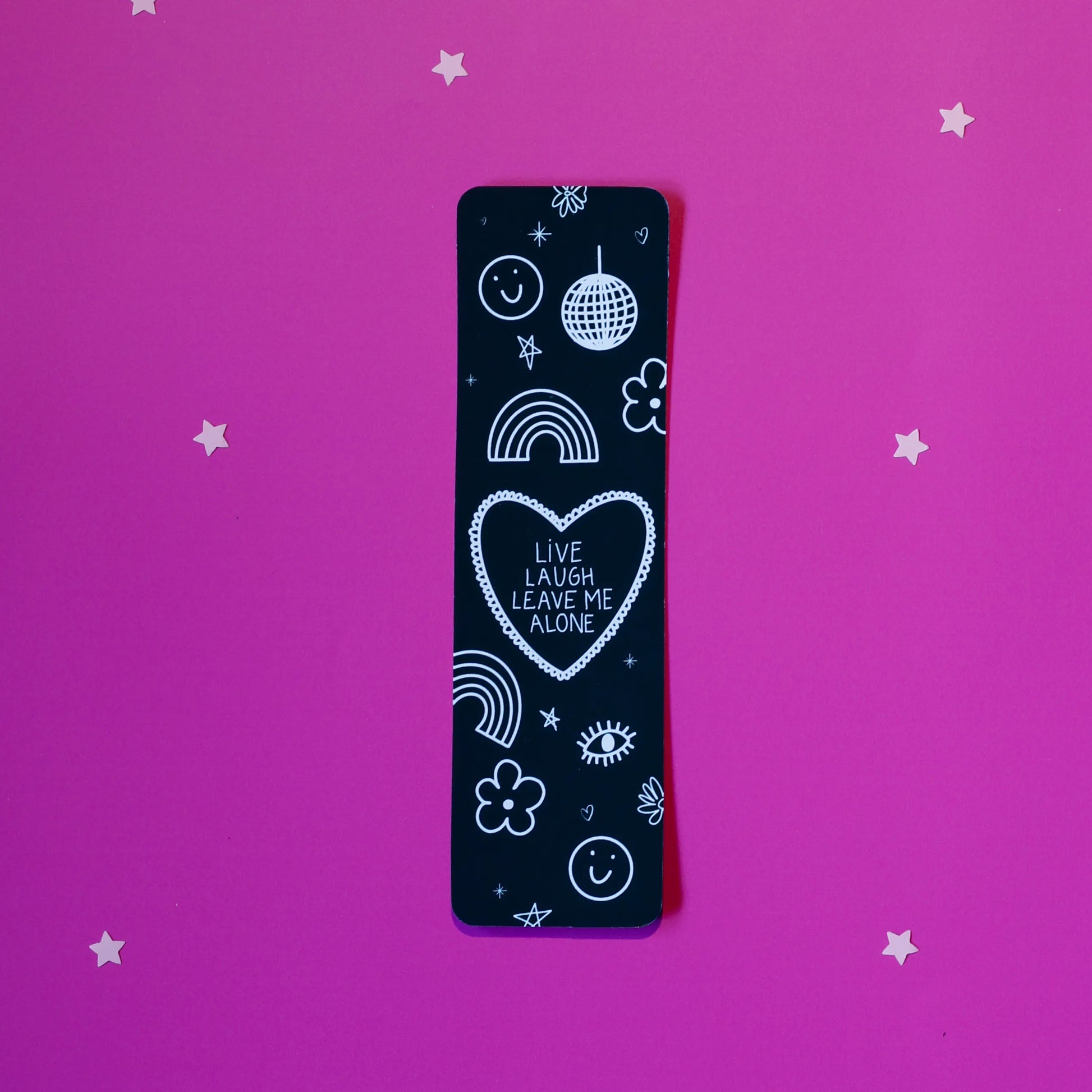 Our 'Live Laugh Leave Me Alone' bold black bookmark sprinkled with cute hearts, rainbows, and doodles says it all. It's perfect for readers who love their stories and their space.