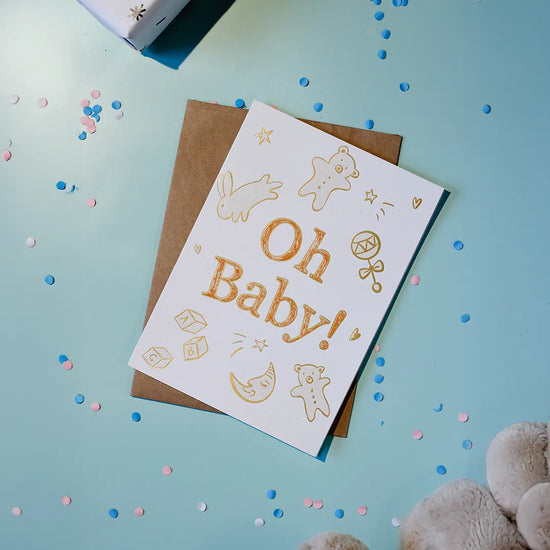 Our adorable 'Oh Baby!' greeting card features gold foil details and charming baby-themed illustrations. It's perfect for baby showers, first cuddles, or just squealing with joy.