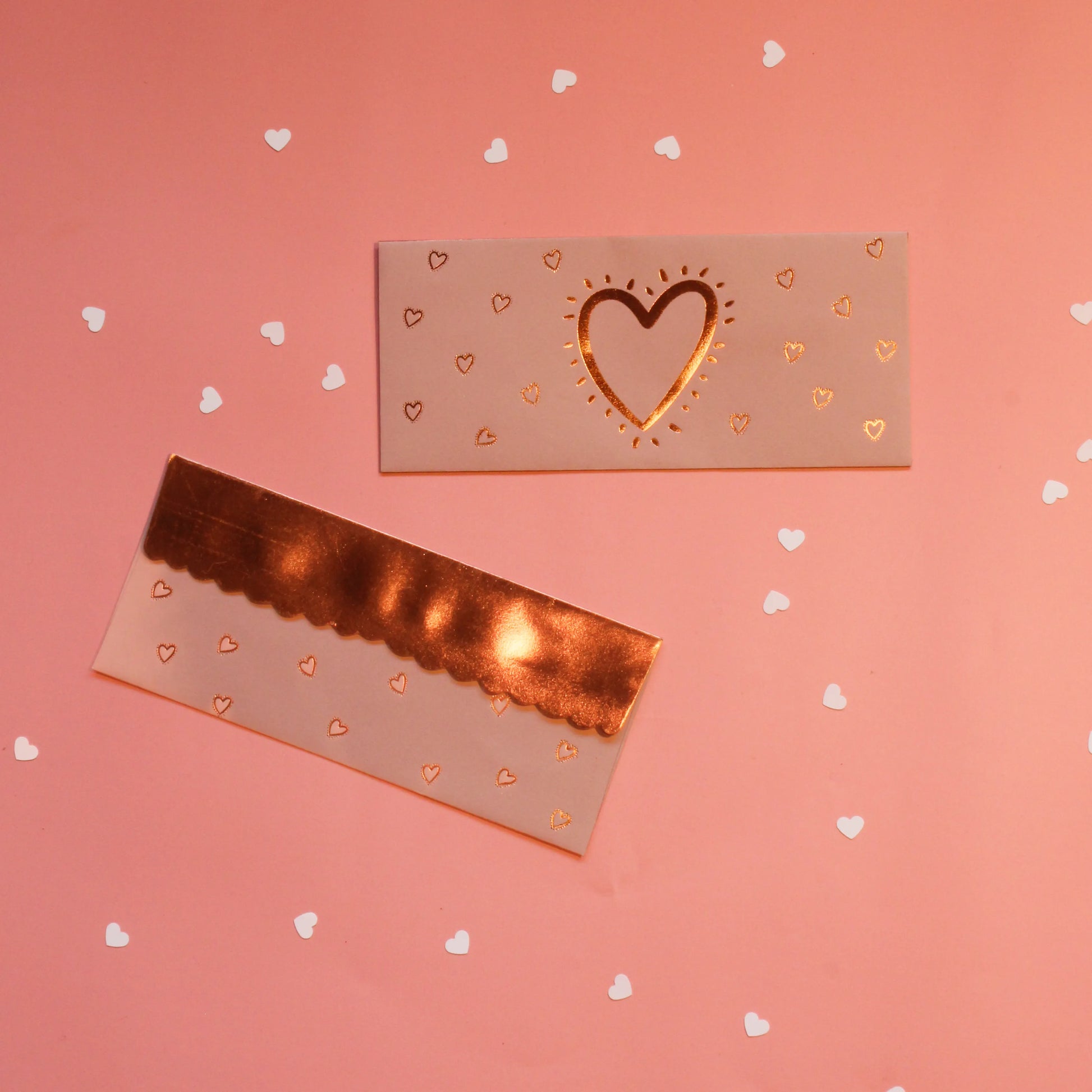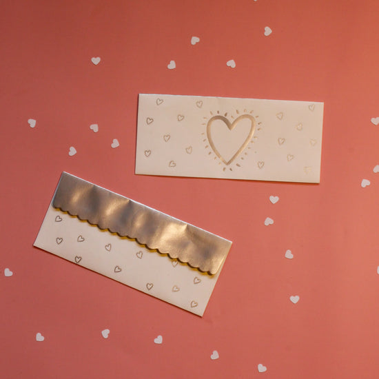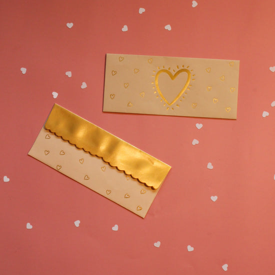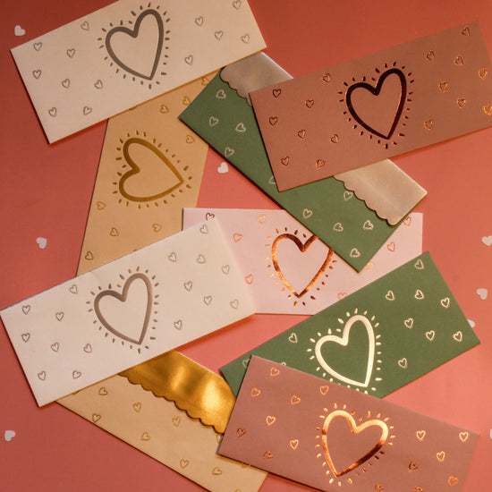 In five soft pastel shades, each design is sprinkled with a delicate heart pattern in silver, gold, or rose gold foil, and finished with a shiny scalloped flap. Each colour repeats twice in the set.